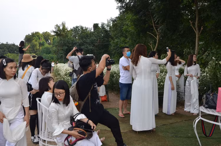 Anh Nguyễn Xuân Hoàng (28 tuổi, quận Hà Đông) cho biết, thời tiết nắng đẹp, lại vào đúng dịp cuối tuần nên anh đã dẫn bạn gái tới chụp ảnh lưu lại khoảnh khắc bên loài hoa trắng muốt này.