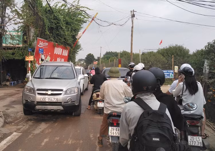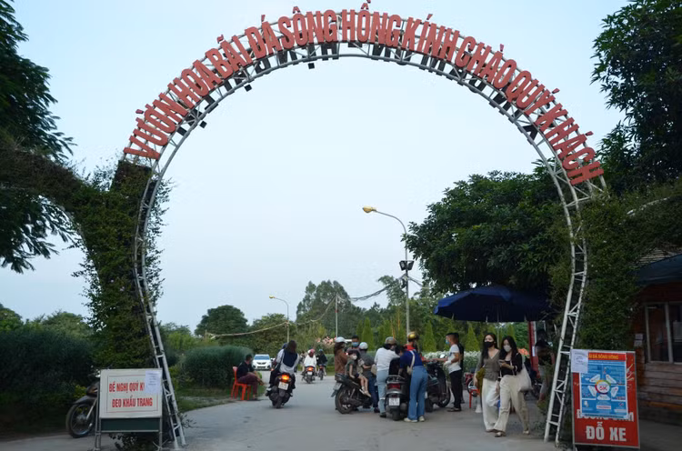 Lối dẫn vào vườn cúc họa mi ở bãi đá sông Hồng (phường Nhật Tân, quận Tây Hồ) ùn tắc vì quá đông du khách.