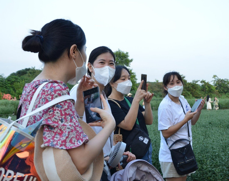 Nhóm du khách người Hàn Quốc thích thú trước loài hoa đặc trưng của mùa đông Hà Nội.