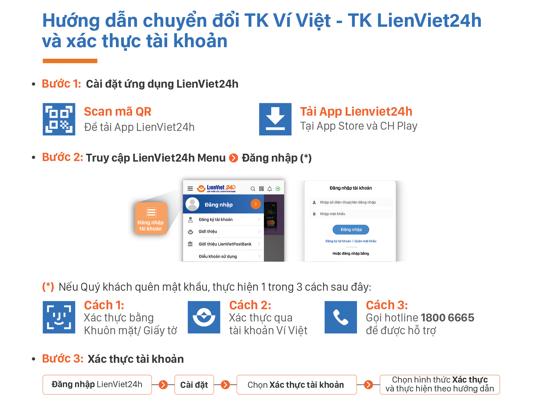 -Nếu Khách hàng chưa có tài khoản LienViet24h tại LienVietPostBank, thực hiện đăng ký EKYC theo hướng dẫn Tại đây hoặc định danh tại quầy giao dịch.