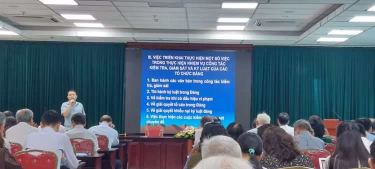 Phó Chủ nhiệm UBKT Đảng ủy khối các Cơ quan Trung ương Nguyễn Trung Nghĩa đã trình bày báo cáo chuyên đề về hướng dẫn nghiệp vụ công tác kiểm tra, giám sát và thi hành kỷ luật Đảng.