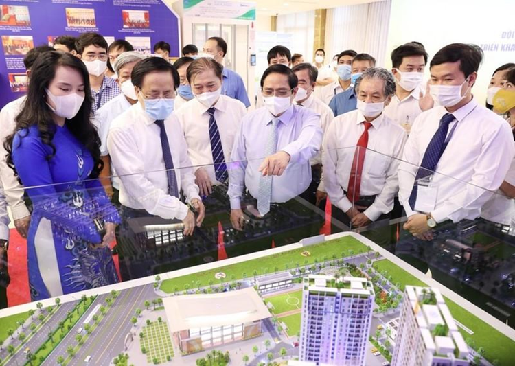 Thủ tướng Phạm Minh Chính tham quan trưng bày các sản phẩm khoa học, kỹ thuật tại Hội nghị đội ngũ trí thức khoa học và công nghệ Việt Nam triển khai thực hiện Nghị quyết Đại hội XIII của Đảng. Ảnh: TTXVN.
