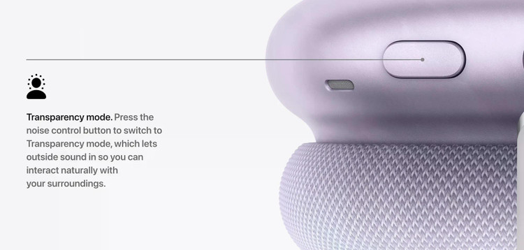 Chế độ Trong suốt (Xuyên âm) - Apple cho biết họ đang sử dụng thuật toán xử lý tín hiệu số mới được xây dựng cho H2 và hệ thống micro của AirPods Max để làm cho âm thanh trong suốt trở nên tự nhiên hơn. Giọng nói của bạn sẽ nghe chân thực hơn, và các âm thanh khác cũng vậy. Với tiếng ồn môi trường được lọc qua các micro của AirPods Max.