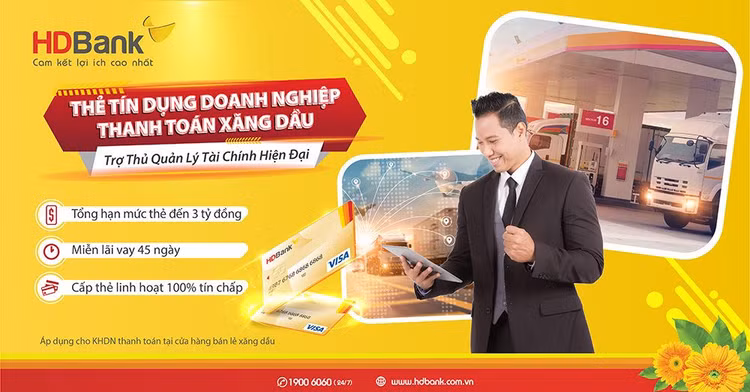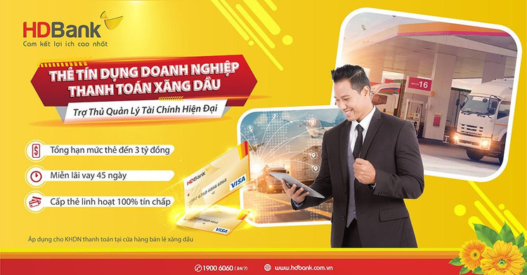 Song song cùng phương thức cấp thẻ hoàn toàn trực tuyến, nhanh chóng, tiện lợi, thẻ tín dụng chuyên biệt dành cho doanh nghiệp thanh toán xăng dầu của HDBank còn mang đến nhiều ưu đãi như: tín chấp 100% cùng mức lãi suất cực kỳ hấp dẫn, chỉ 12%/năm; 45 ngày không lãi suất; không giới hạn số lượng thẻ phụ phát hành.