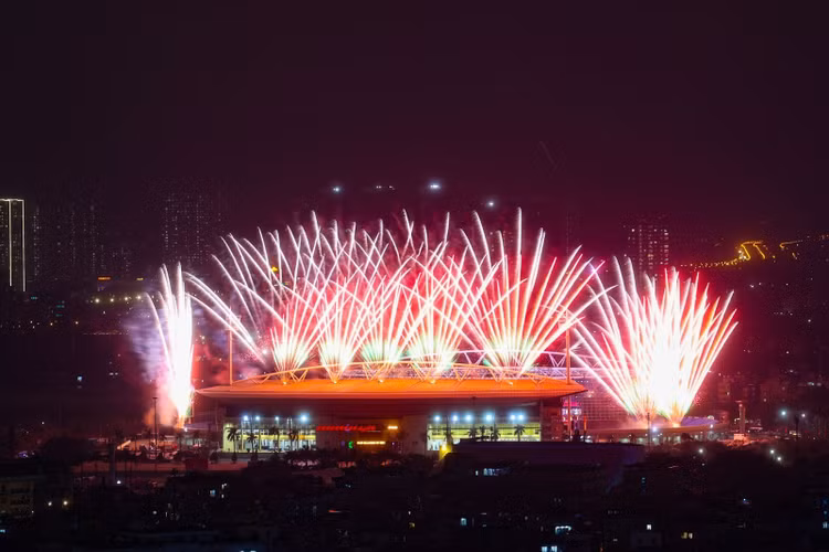 Tập đoàn Sun Group đã phối hợp chặt chẽ cùng Bộ Tư lệnh Thủ đô và Công ty TNHH Một thành viên Hóa chất 21 (Z121) để xây dựng, triển khai trận địa pháo hoa tại khu vực SVĐ quốc gia Mỹ Đình. Trong đó, 950 giàn phun pháo hoa và 4.400 ống pháo hoa hỏa thuật được lắp đặt trực tiếp trên mái nhà và hai bên cánh khán đài B theo địa hình vòng cung. Bên ngoài sân là trận địa 4.600 pháo hoa nổ tầm cao được bố trí từ nửa đường Lê Đức Thọ qua cột đồng hồ đến bãi đất trống trước Cung thể thao dưới nước, phường Từ Liêm.