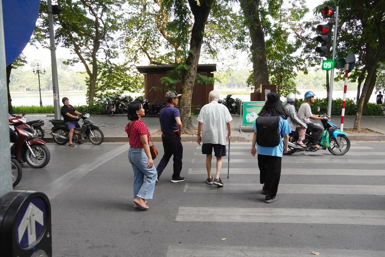 | Đối với du khách nước ngoài, việc sang đường theo tín hiệu đèn đã trở thành thói quen và họ thực hiện rất nghiêm mỗi khi qua đường. |