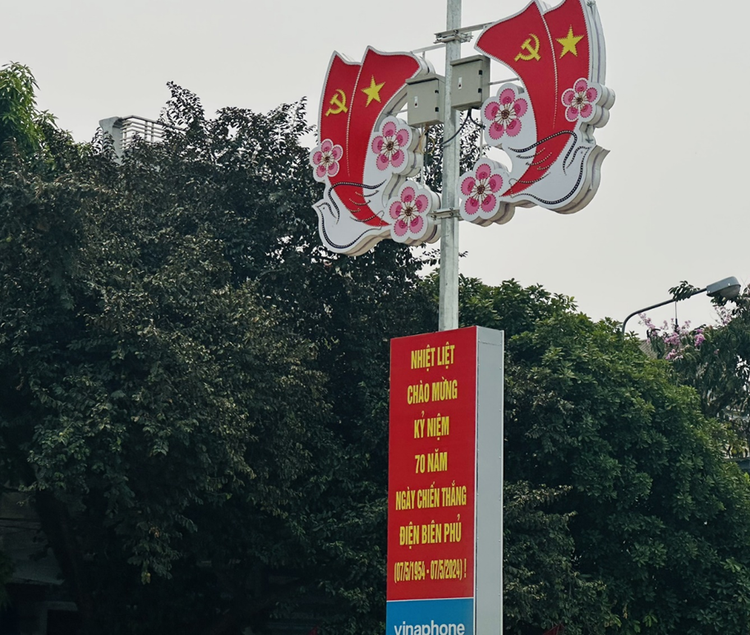 Pano, áp-phích tuyên truyền cổ động được treo trên cột đèn đường, xen kẽ là hình tượng hoa ban, loài hoa đặc trưng của tỉnh Điện Biên.