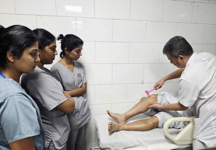 TS.BS Nguyễn Trung Nguyên - Giám đốc Trung tâm Chống độc, Bệnh viện Bạch Mai kiểm tra phản xạ của các bệnh nhân ngộ độc cá chình. Ảnh BV Bạch Mai