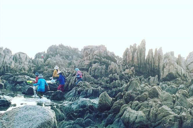 Thảm đá phía Đông, xã đảo Nhơn Châu luôn sẵn sàng làm “mồi” bất cứ ai đùa giỡn. Nó mai phục ở khắp nơi. Trước mặt, đá thịt trơn láng, lúc nhúc rêu. Sau lưng, đá chẻ xù xì, mũi sắc lẻm như con dao chọc tiết lợn. Cụ Nguyễn Hát (65 tuổi) trùm chiếc mũ sói thời Liên Xô, dẫn đầu “đoàn quân cào mứt” lao phăng phăng.