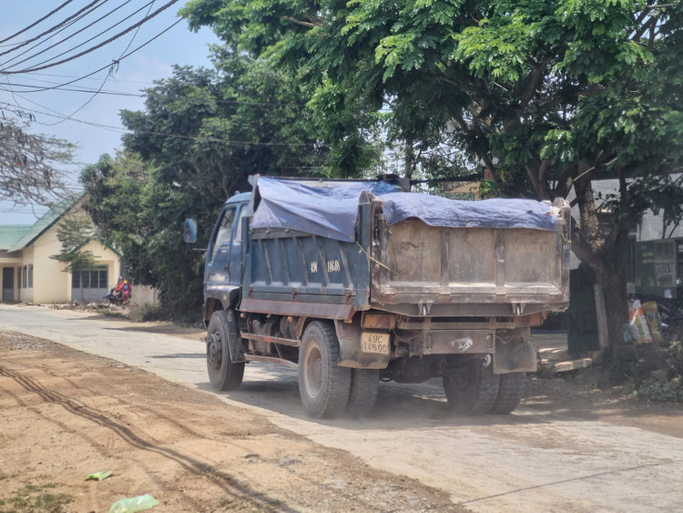 | Xe tải chở đá không phủ bạt lưu thông qua tuyến đường liên xã thuộc xã Tu Tra. |