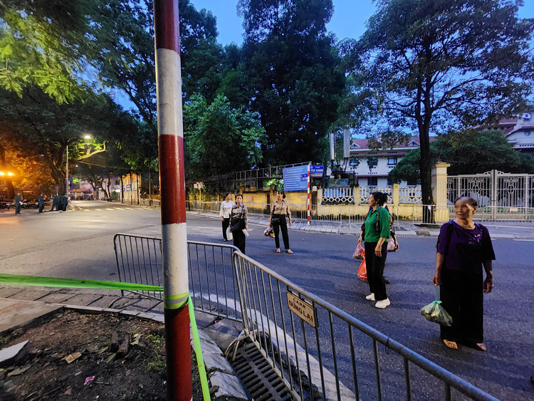 4h05: Nhà tang lễ Quốc gia số 5 Trần Thánh Tông, thành phố Hà Nội lực lượng chức năng đã sẵn sàng làm nhiệm vụ. Một số người dân của tỉnh Bắc Giang có mặt từ rất sớm để chuẩn bị làm thủ tục vào viếng Tổng Bí thư Nguyễn Phú Trọng.