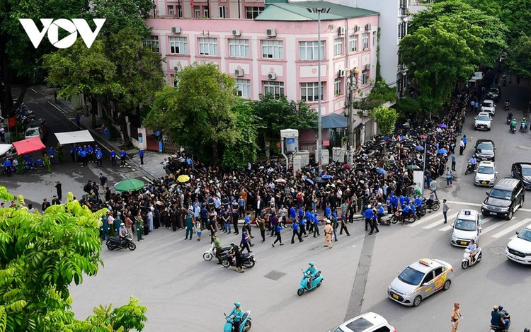 | Dòng người kéo dài hết phố Lê Quý Đôn, xếp hàng từ đê Nguyễn Khoái để vào cổng Nguyễn Cao viếng Tổng Bí thư Nguyễn Phú Trọng. (Ảnhh: VOV) |