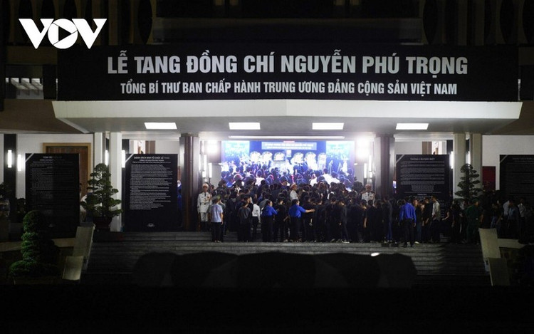 Thông tin từ Ban tổ chức Lễ tang: "Do số lượng người dân đến viếng Đồng chí Tổng Bí thư Nguyễn Phú Trọng tại Hội trường Thống Nhất vào chiều tối nay rất đông nên UBND thành phố quyết định giờ viếng đến 23h00 thay vì đến 22h00 như thông báo trước, nhằm tạo mọi điều kiện để người dân được đến viếng thuận lợi nhất. 23h Ban tổ chức sẽ không nhận đăng ký vào viếng và giờ viếng ngày mai bắt đầu từ 7h và kết thúc lúc 12h30”.