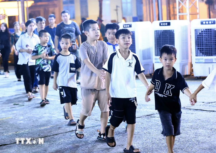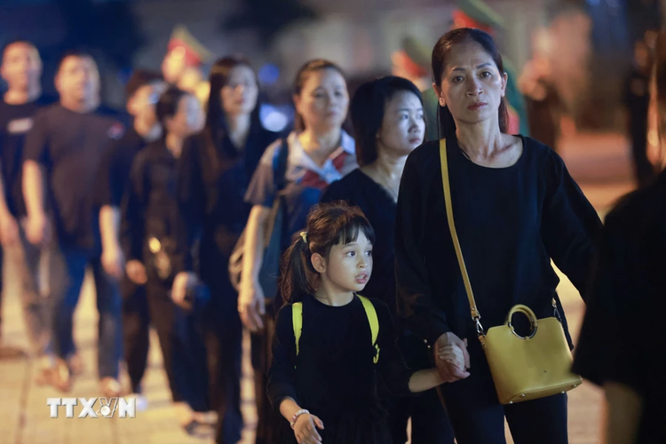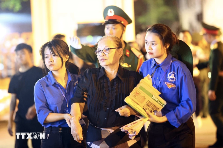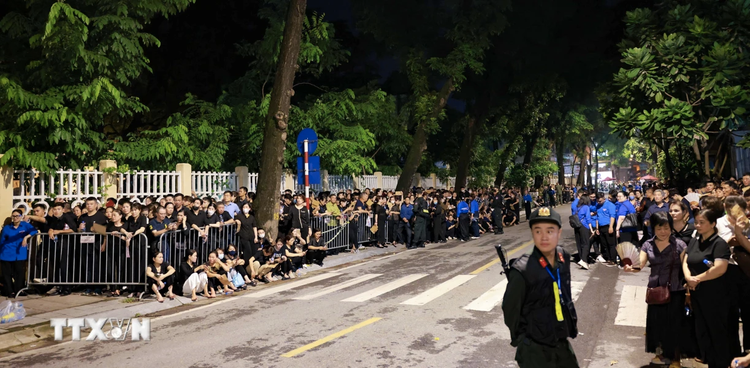 Hàng vạn người dân xếp hàng trong đêm vào viếng Tổng Bí thư Nguyễn Phú Trọng. Theo thông báo của Ban Tổ chức Lễ tang, lễ viếng Tổng Bí thư Nguyễn Phú Trọng trong ngày 25/7 sẽ đến 22h nhưng càng về đêm, dòng người hướng về Nhà Tang lễ Quốc gia càng đông. (Ảnh: TTXVN)