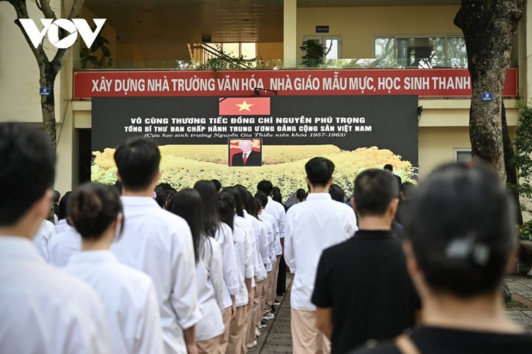 12h38: Lễ tưởng niệm Tổng Bí thư Nguyễn Phú Trọng tại trường THPT Nguyễn Gia Thiều (Gia Lâm, Hà Nội) - nơi Tổng Bí thư từng theo học.