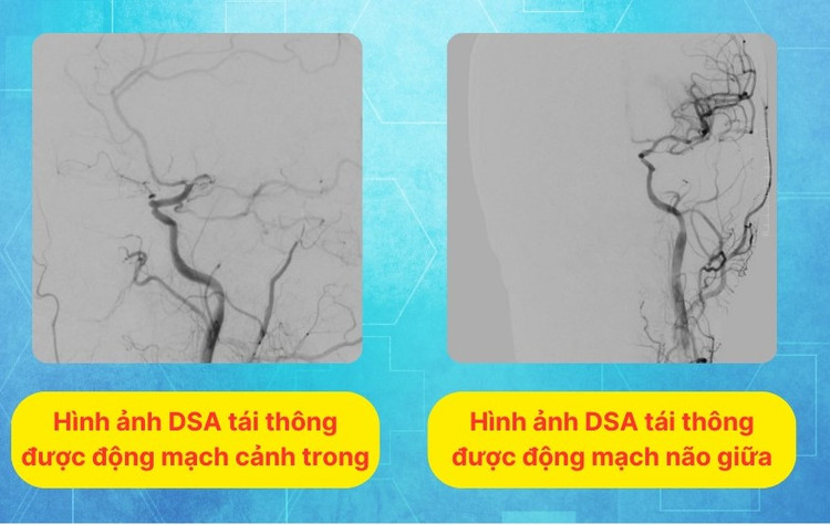 Theo phim chụp bác sĩ nghi ngờ có tắc mạch máu lớn nên bệnh nhân được tiếp tục thực hiện chụp CT mạch máu não, kết quả cho thấy tắc động mạch cảnh trong và hẹp nặng đoạn M1 não giữa bên trái, đột quỵ giờ thứ 7.