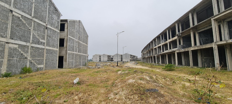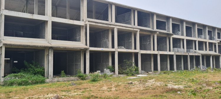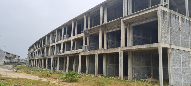 Một dãy nhà liền kề mới đổ trụ bêtông, nhưng dừng thi công lâu ngày, lõi sắt đã hoen rỉ.