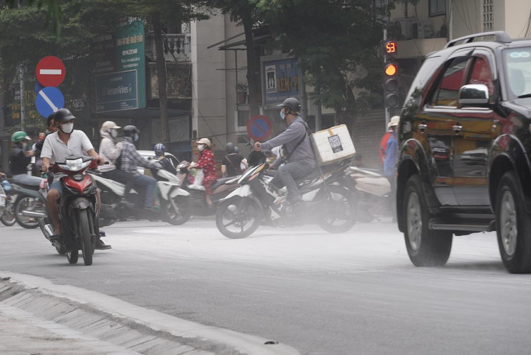 Một vài hình ảnh PV Khoa học & Đời sống ghi lại hiện trạng bụi trắng bay mù mịt khu vực ngã tư phố Tôn Đức Thắng – Cát Linh, ảnh hưởng đến môi trường, sức khỏe người dân.