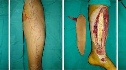 Bị tai nạn giao thông cách đây 3 năm, anh Đỗ Văn T. 39 tuổi (Thái Nguyên) mất hẳn một mảng lớn da, thịt sát tận xương ở vùng cẳng chân bên phải. Anh đã nhiều lần điều trị cắt lọc tổn thương chờ lành để ghép da, nhưng càng ngày các tổn thương càng lan rộng, hoại tử gây đau đớn khiến anh không làm ăn được gì. Đặc biệt, cả vùng cẳng chân bị lộ ra lâu ngày khiến anh bị viêm xương nặng nên nhiều bệnh viện khuyên tháo khớp, cắt bỏ đoạn chân dưới tránh nguy cơ viêm xương kéo dài nguy hiểm cho tính mạng. May mắn, khi điều trị lấy vạt da cơ từ đùi trước xuống ghép cho vùng cẳng chân bị tổn thương lâu ngày, vạt sống tốt và sau 6 tháng điều trị ngày 15/8 khám lại, anh đã thoát khỏi nguy cơ bị cắt chân.