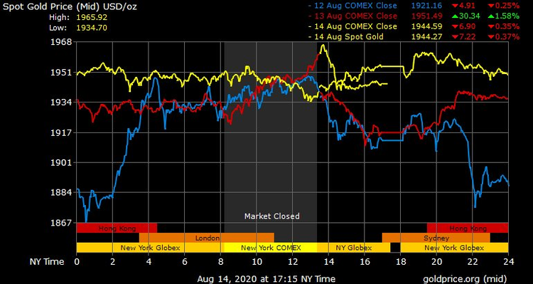 Trên thị trường vàng thế giới, giá vàng giao ngay chốt phiên đêm qua tại Mỹ giảm 8 USD xuống 1.944,8 USD/ounce. Giá vàng tương lai giao tháng 9 trên sàn Comex New York giảm 16,5 USD xuống 1.942,8 USD/ounce.