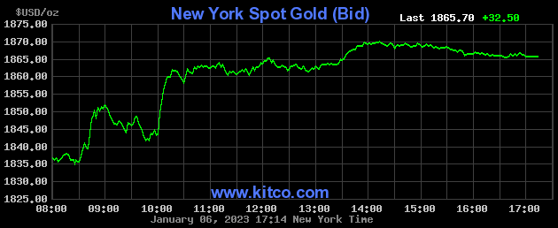 Giá vàng chạm ngưỡng 1.870 USD/ounce trong phiên giao dịch ngày 6/1 tại Mỹ. Ảnh: Kitco.com.