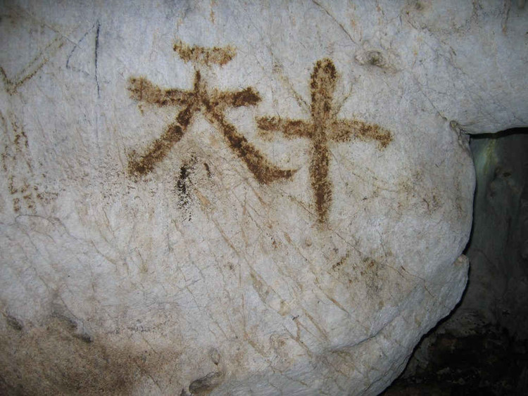 Ở ngách bên cạnh, cách mộ thân cây khoảng hơn 20m là một vách đá dựng chắn lối đi, có hai chữ “Thiên thập” viết bằng chữ Hán ở tầm vừa tay với người lớn. Cạnh đó là hình một tam giác có một đỉnh quay xuống dưới. Phía dưới nền hang đã bị đào nham nhở, dấu hiệu đã có người đào bới.