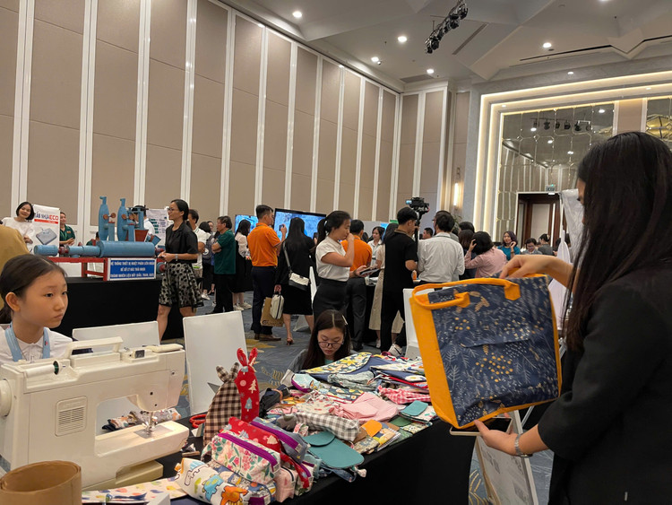 Chị Hà Phan Kim Nguyệt - Founder UPGREEN Vietnam giới thiệu các sản phẩm nhựa tái chế tại Triển lãm.