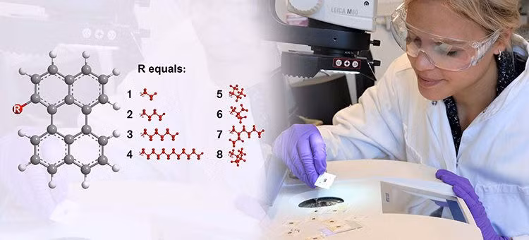 NCS Sandra Hultmark làm việc với mẫu vật liệu thủy tinh mới bằng máy FSC (Đo nhiệt lượng quét nhanh). Hình minh họa bên trái là tám phân tử perylene khác nhau được khảo sát trong nghiên cứu tạo thủy tinh.