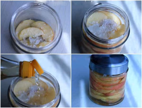 Xếp táo vào trong lọ thủy tinh theo từng lớp. Kế đến là một lớp đường.