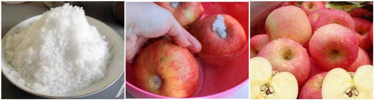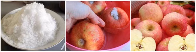 Ngâm táo vào chậu nước. Chà xát vỏ táo với một chút muối cho sạch bụi bẩn và lớp vỏ rám bên ngoài. Do thực phẩm bây giờ có nhiều chất bảo quản, đặc biệt là táo và lê nên việc rửa sạch táo bằng muối rất quan trọng.