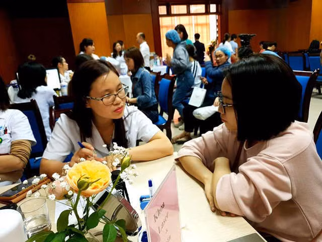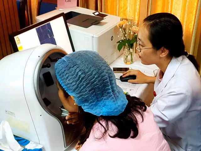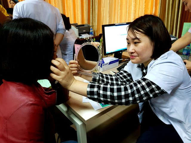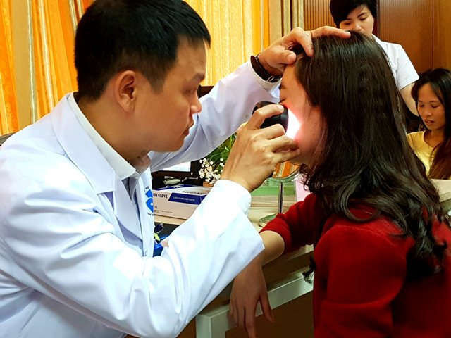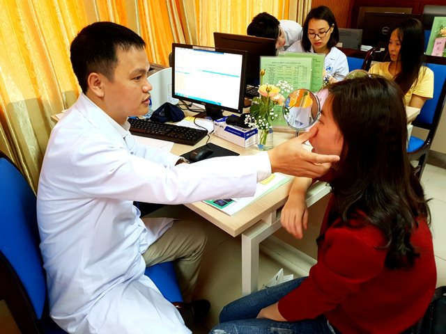 Bác sĩ thăm khám da cho chị em tại ngày hội làm đẹp.