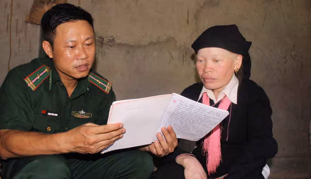 Thiếu tá Phạm Công Khanh dạy chữ cho học viên đặc biệt Phàn Thị Hằng. Chị Hằng bị cận bẩm sinh, mắt mờ khó nhìn thấy con chữ, nhưng chị đã cố gắng học xong lớp 5.