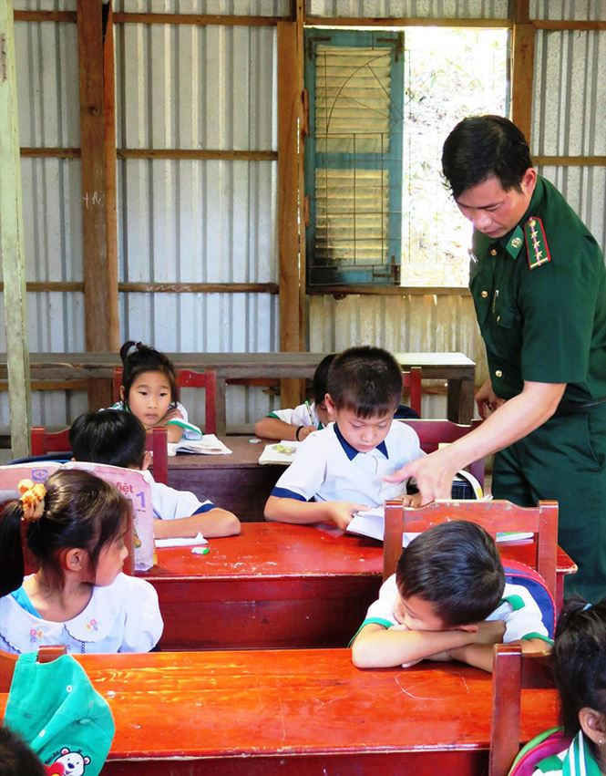 Lớp học tình thương Biên phòng do thượng úy Trần Bình Phục đứng lớp chia thành 2 phòng, với 25 em học sinh, cùng học một buổi. “Tôi dạy lớp ghép, các em học từ lớp 1 đến lớp 5 nên rất bận rộn. Hễ cho nhóm này làm bài tập, tôi sang phòng bên dạy chữ, dạy toán…” – Thầy Phục chia sẻ.