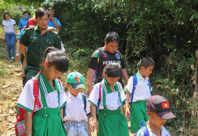 Sau giờ học, thầy giáo Biên phòng lại cõng các em về nhà dưới ghềnh sát biển.