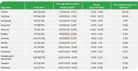 Một nghiên cứu gần đây của Common Sense Media và Bệnh viện Nhi đồng CS Mott thuộc Đại học Michigan cho thấy trẻ em từ 11 đến 17 tuổi dành trung bình 1 giờ 52 phút cho TikTok mỗi ngày, chiếm gần 40% tổng thời gian sử dụng điện thoại cả ngày.