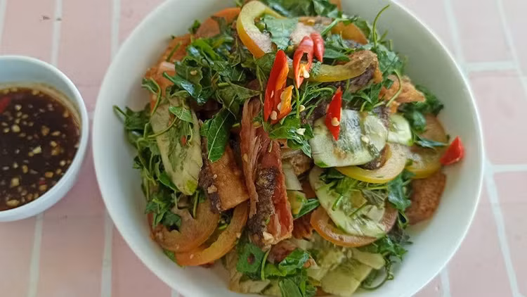 Gỏi sầu đâu khô cá lóc có vị đắng nhẹ tự nhiên của lá sầu đâu và vị mặn mặn tự nhiên của khô cá lóc dai giòn, ăn kèm với dưa leo và cà chua cùng nước mắm chua cay tạo cho món ăn một hương vị mới lạ độc đáo mà vẫn vô cùng thơm ngon hấp dẫn.