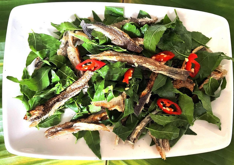 Hương vị tổng hòa của món ăn gỏi sầu đâu trộn cá đồng khô nướng mang đến cảm giác lạ miệng: Mặn của khô cá, béo của thịt ba chỉ và đậu phộng, chua của xoài, cay của mắm me và vị đắng đặc trưng từ lá, hoa sầu đâu.