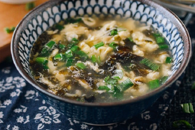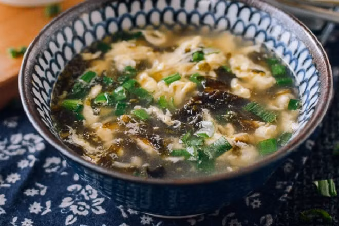 Trứng cho vào bát, đánh tan. Cho nước đun sôi, thêm xíu dầu ăn cùng rong biển đã cắt nhỏ vào. Đun trong khoảng 20 giây sau đó đổ trứng vào, khuấy tròn để trứng quyện vào rong biển. Thêm hành lá và nêm nếm cho vừa miệng.