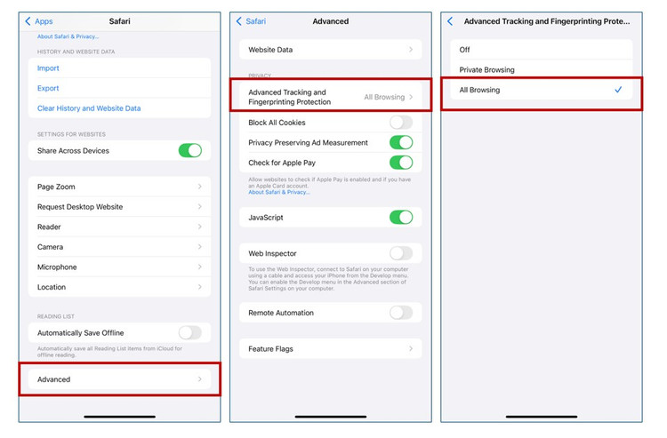 Trong cài đặt Safari trên iPhone, ở mục "Nâng cao", bạn sẽ thấy tùy chọn có tên "Bảo vệ theo dõi và dấu vân tay nâng cao". Theo mặc định, tùy chọn này hiện đang được chuyển thành "Duyệt riêng tư", nhưng sẽ mặc định là "Duyệt toàn bộ" trong iOS 26.