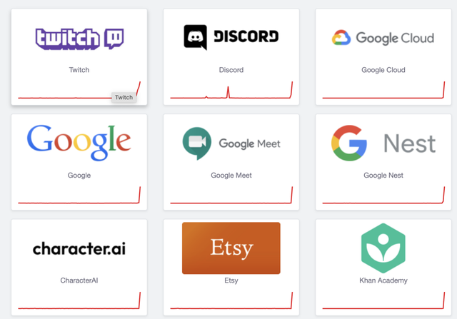 Dưới đây là danh sách các nền tảng ghi nhận số lượng lớn báo cáo lỗi từ người dùng trên Down Detector tính đến thời điểm 2 giờ 35 phút sáng ngày 13/6 theo giờ Việt Nam: Discord, Google (bao gồm Google Cloud, Gmail, Google Meet và các dịch vụ khác), Spotify, Twitch, character.ai, Rocket League, Cloudflare, Etsy, Pokémon Trading Card Game, Snapchat, fuboTV, Anthropic (đơn vị phát triển chatbot Claude), Shopify, Gemini, MLB.tv, Doordash, kea, Equifax, Marvel, Vimeo, Nintendo Switch Online, Gitlan, Calendly...
