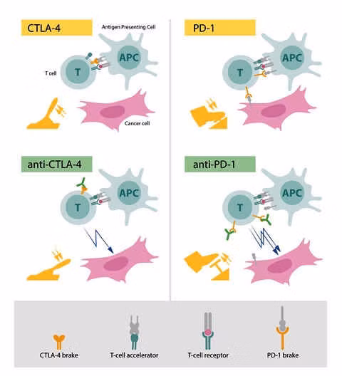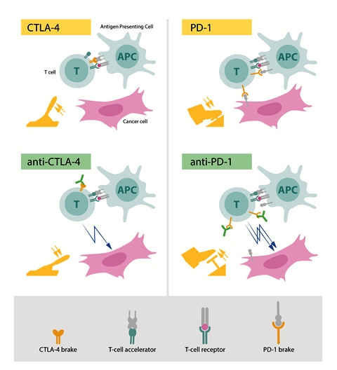 Trong cơ thể bình thường thì CTLA-4 và PD-1 sẽ gắn với các protein trên tế bào trình diện kháng nguyên (Antigen presenting cell -APC), giúp tế bào T không tấn công các tế bào bình thường, tránh gây ra bệnh tự miễn. Ngoài ra, trên bề mặt tế bào ung thư có PD-L1 có khả năng gắn với PD-1 trên tế bào T, làm cho tế bào T bị ức chế nhiều hơn, giúp tế bào ung thư trốn thoát hệ thống miễn dịch.