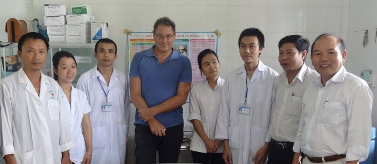 GS Huỳnh Đình Chiến (ngoài cùng bên phải) cùng nhóm nghiên cứu tại Trung tâm y tế huyện Hướng Hóa (Quảng Trị) trong chuyến nghiên cứu khảo sát đầu năm 2019.