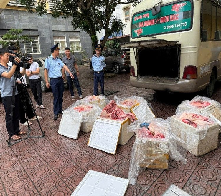 Cơ quan chức năng tỉnh Hà Giang phát hiện một chiếc ô tô cất giấu 450 kg thực phẩm là thịt lợn, chứa trong 7 thùng xốp, có màu sắc thâm đen, mùi hôi thối...