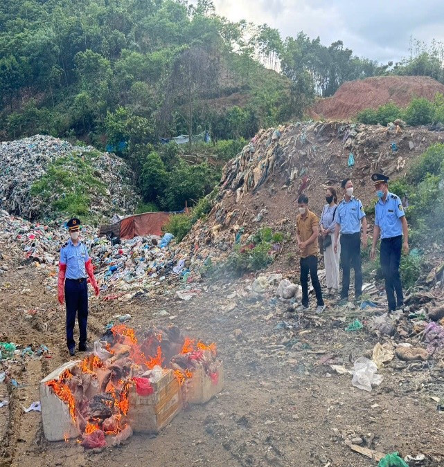 Ngành chức năng tổ chức tiêu hủy 450 kg thịt lợn vi phạm ATTP - Ảnh Chi cục QLTT Hà Giang