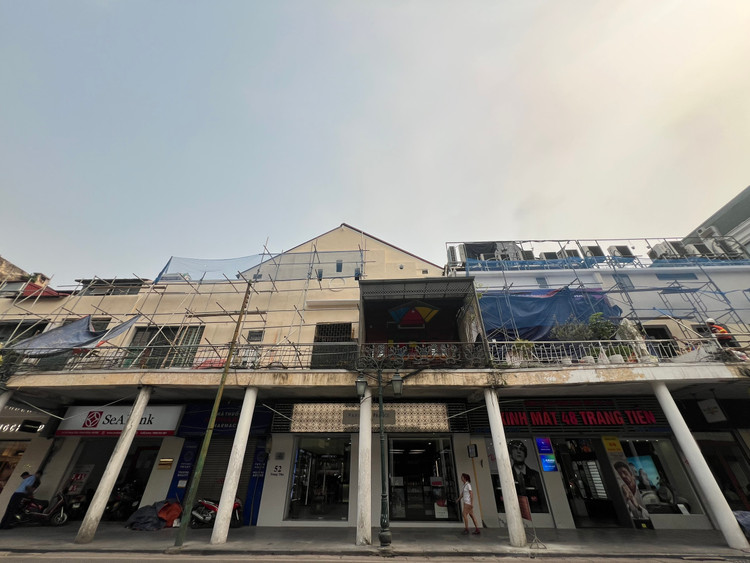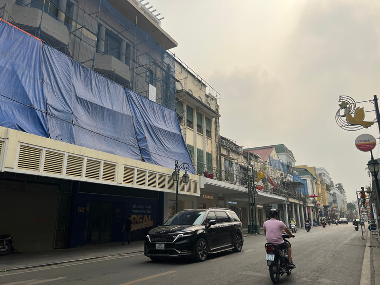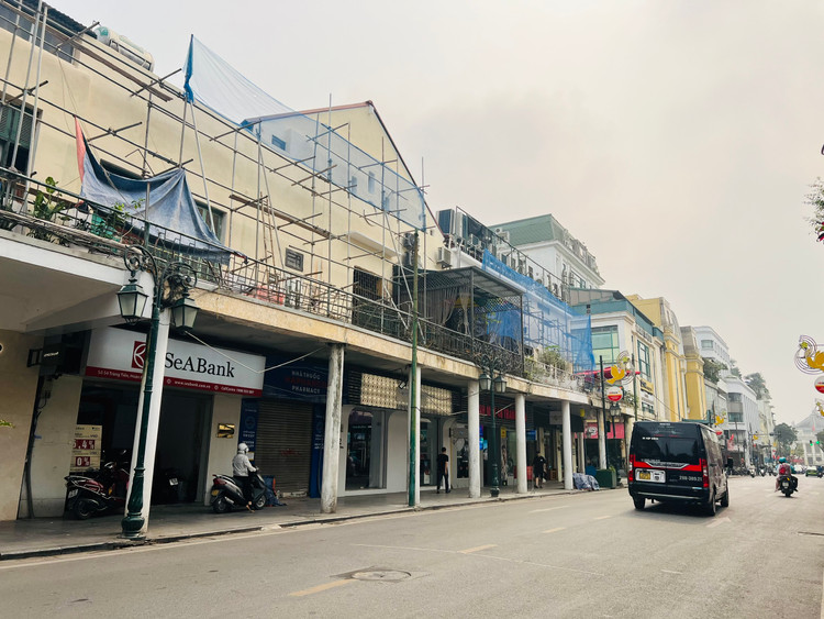 Theo ghi nhận của PV Khoa học & Đời sống, khu vực tầng 2 tuyến phố Tràng Tiền được quây bạt, dựng rào để sửa chữa.