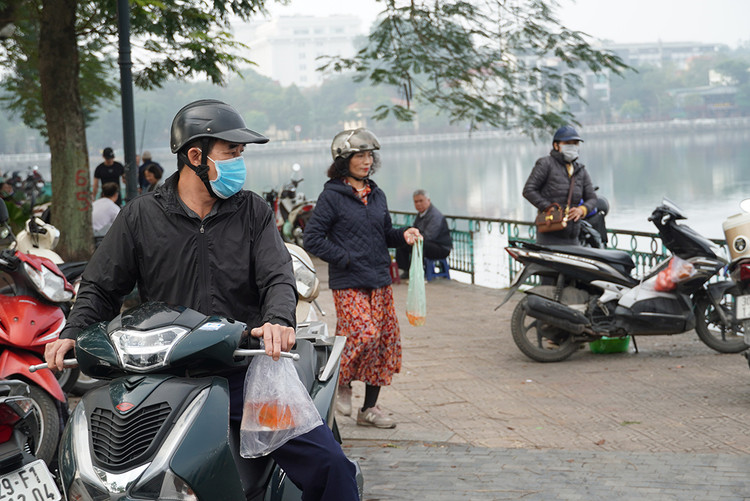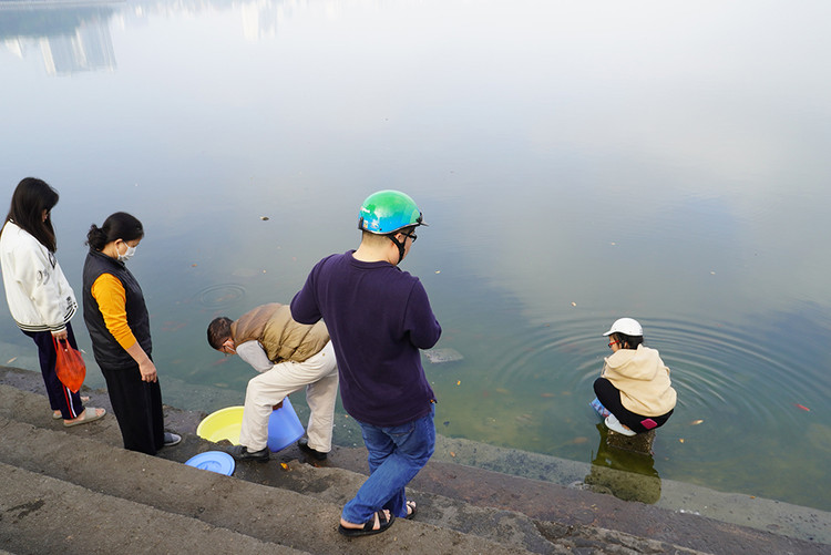 Ngay từ sáng sớm, rất đông người dân đã ra khu vực Hồ Tây để thả cá.