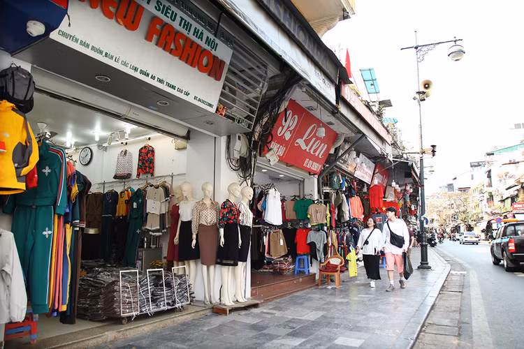 | Du khách nước ngoài thả bộ mua sắm trên vỉa hè phố Hàng Gai. |