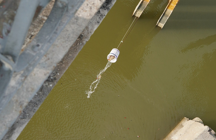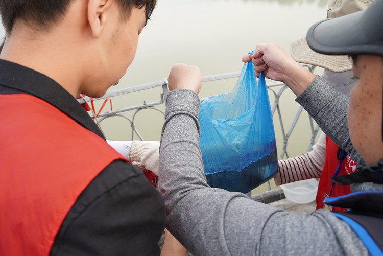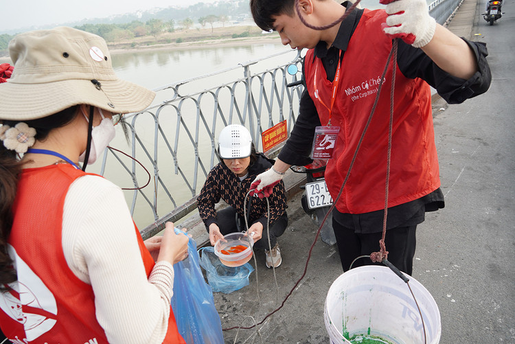 | Để thả cá xuống sông, các bạn trẻ đã dùng một chiếc xô nhựa đựng cá. |