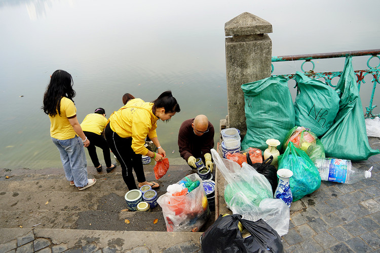 | Tại khu vực Hồ Tây, các bao tải đã đầy ắp túi nilon. |