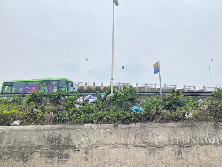 Rác thải bừa bãi tại phần chân cầu Vĩnh Tuy.
